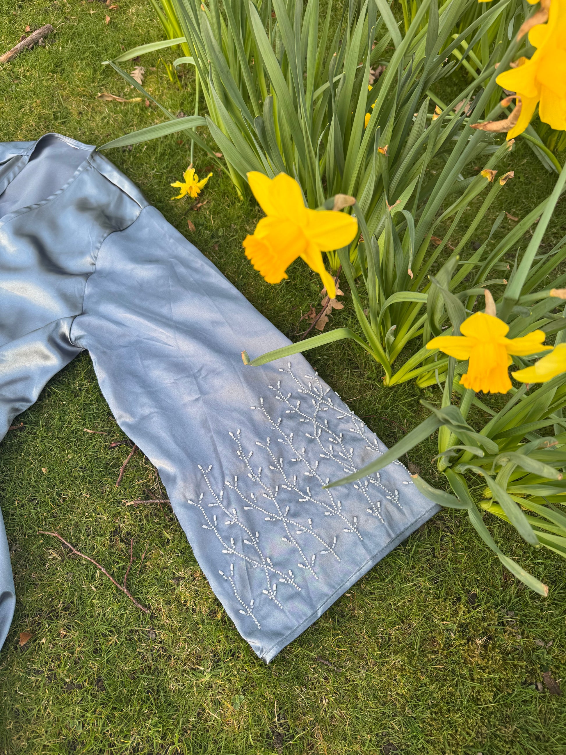 Indulge in elegance with our Pearl Petals Abaya. Made with soft material, this open abaya can also be closed with button poppers for added versatility. Adorned with delicate pearl embroidery up the sleeves, it also features convenient pockets.